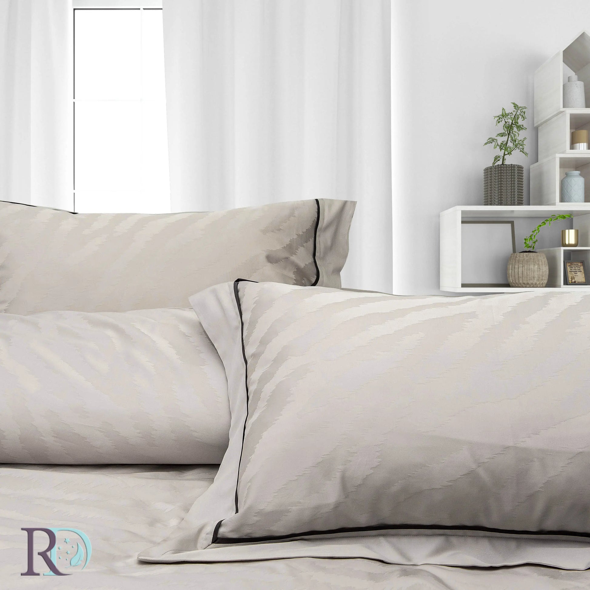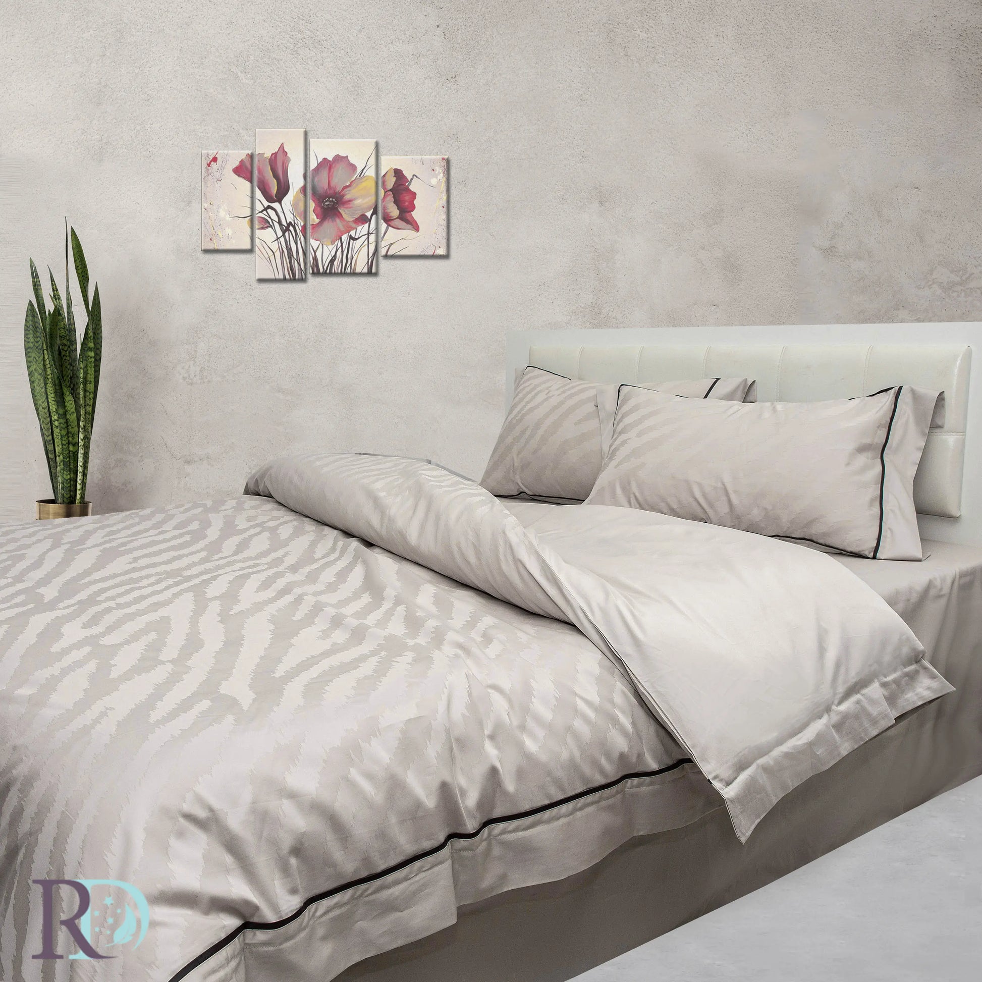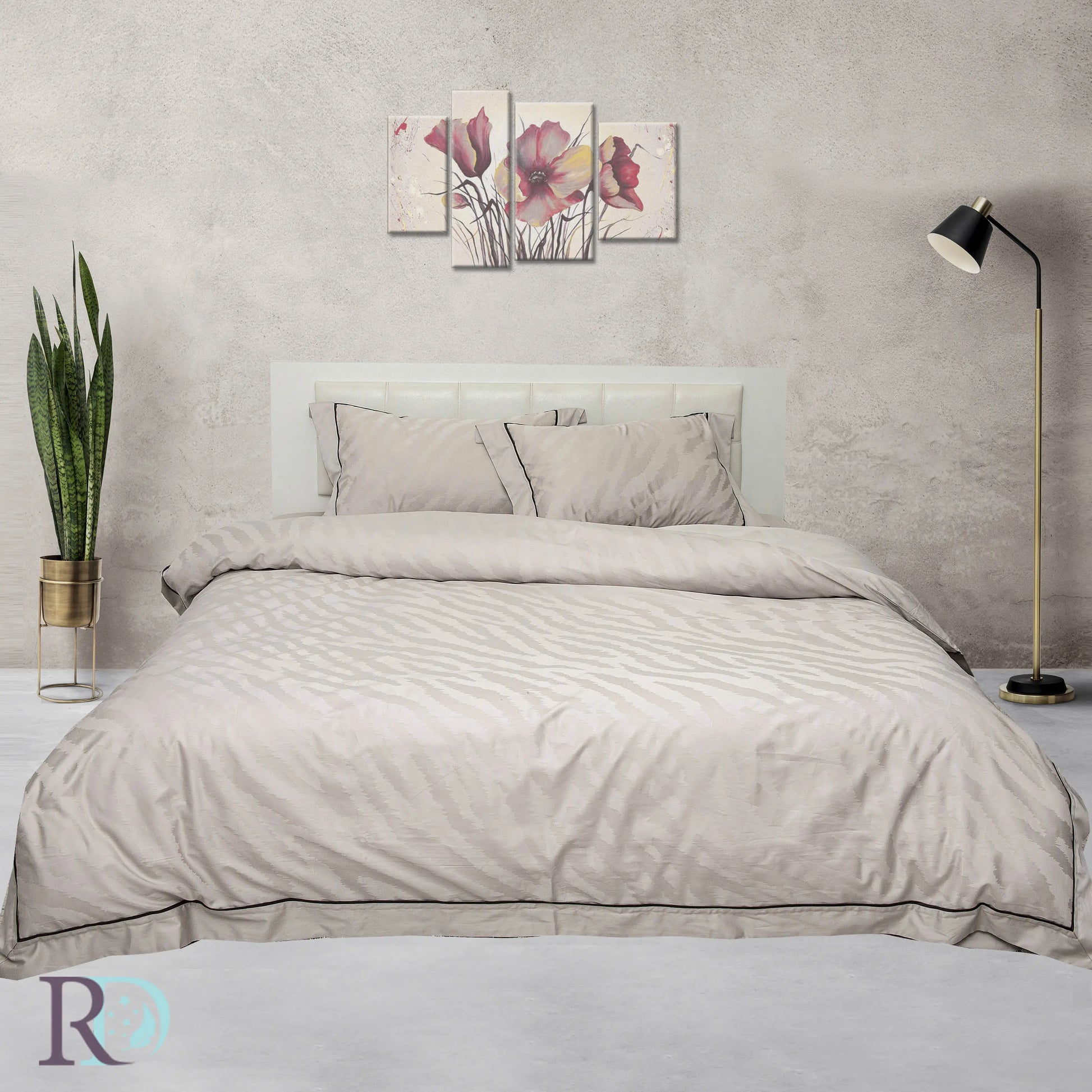 Спален комплект „Алекса бежово“ е изработен от плътен жакардов памучен сатен (100% памук) – мек, гладък и устойчив. Комплектът е със стилна визия и периферия на плика и калъфките. Предлага се в луксозна кутия – подходящ за подарък.