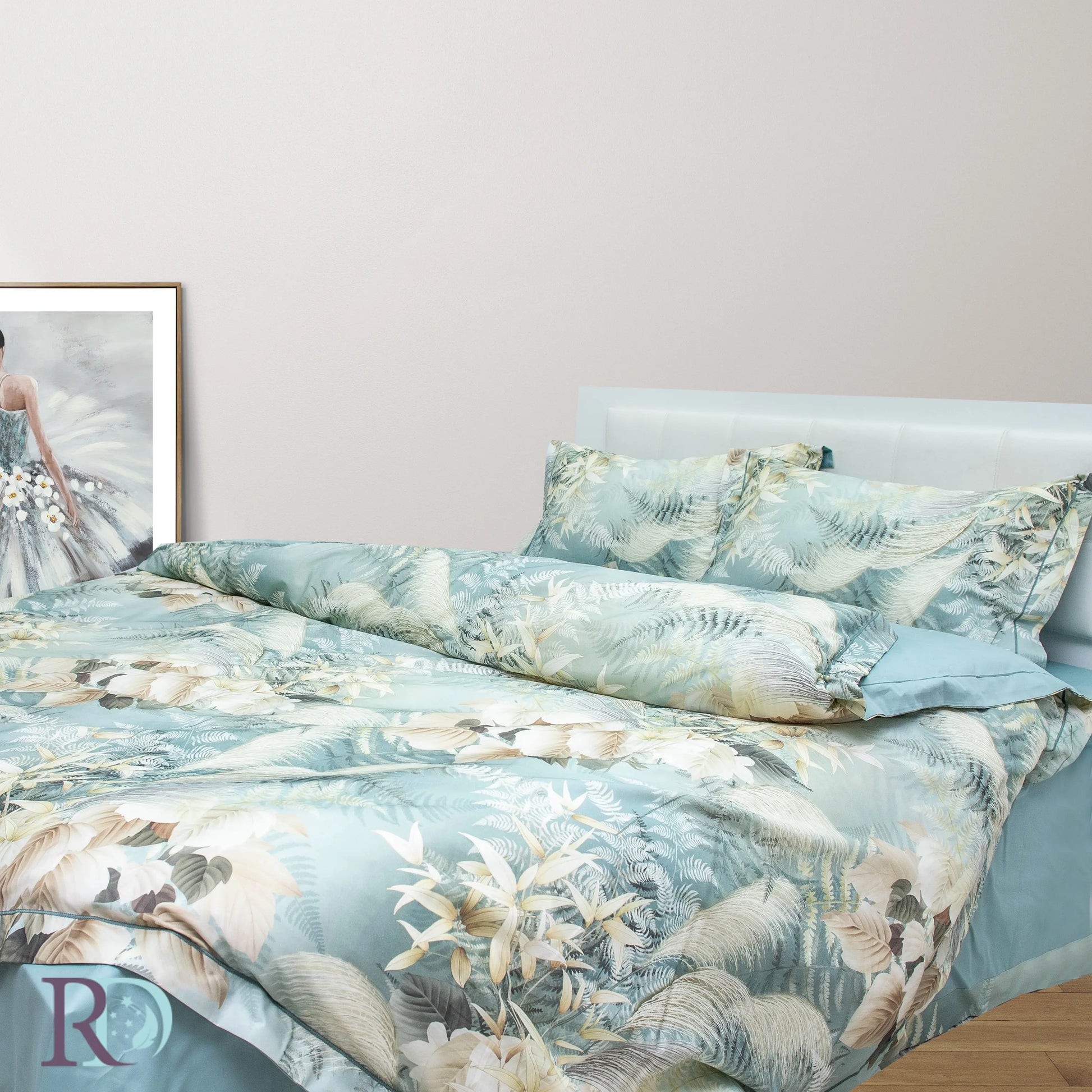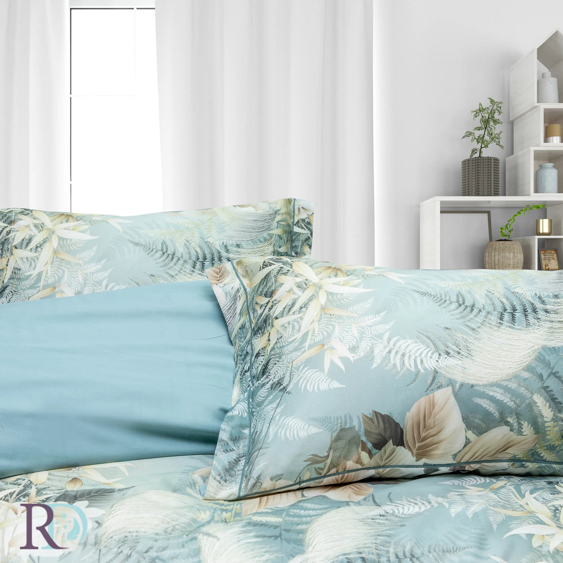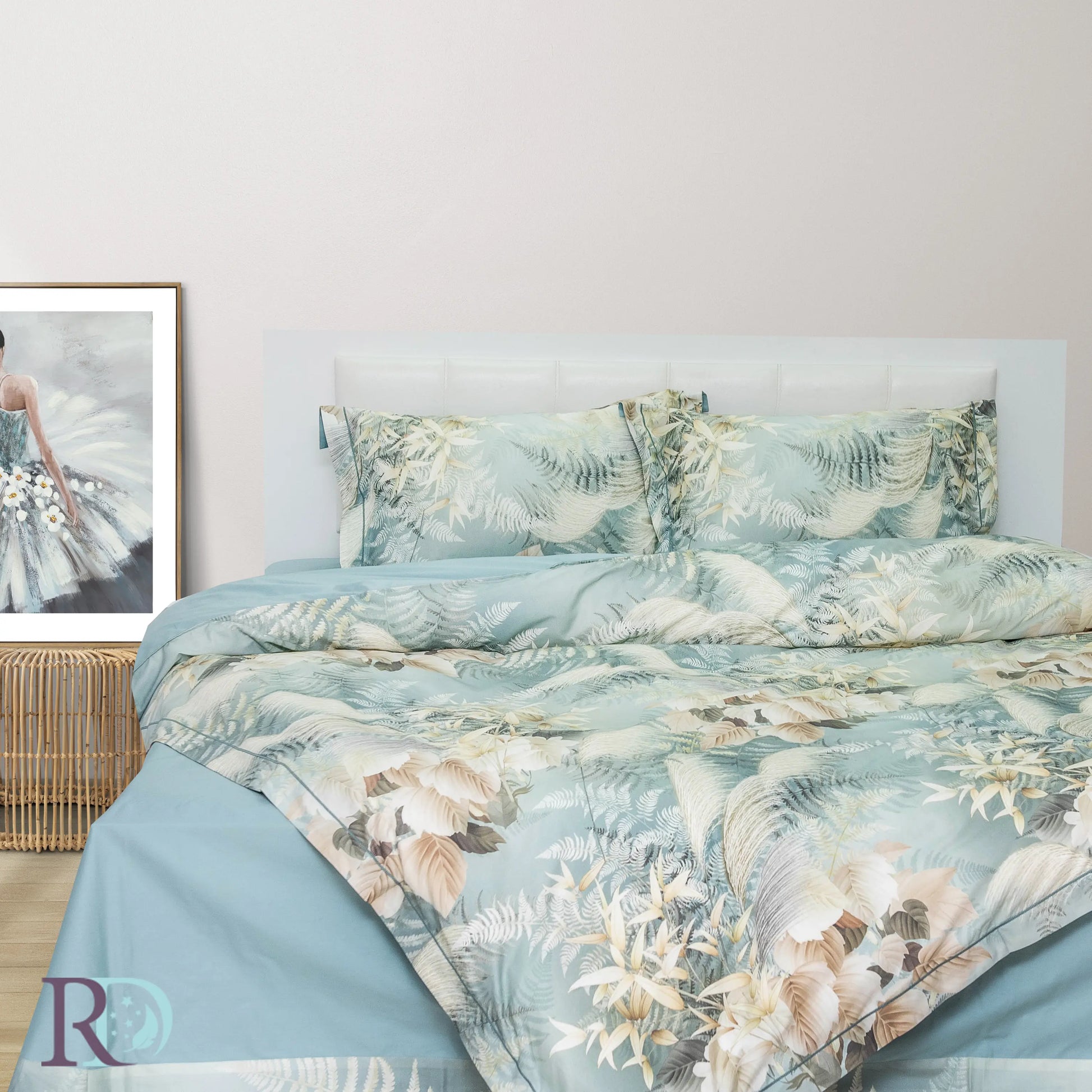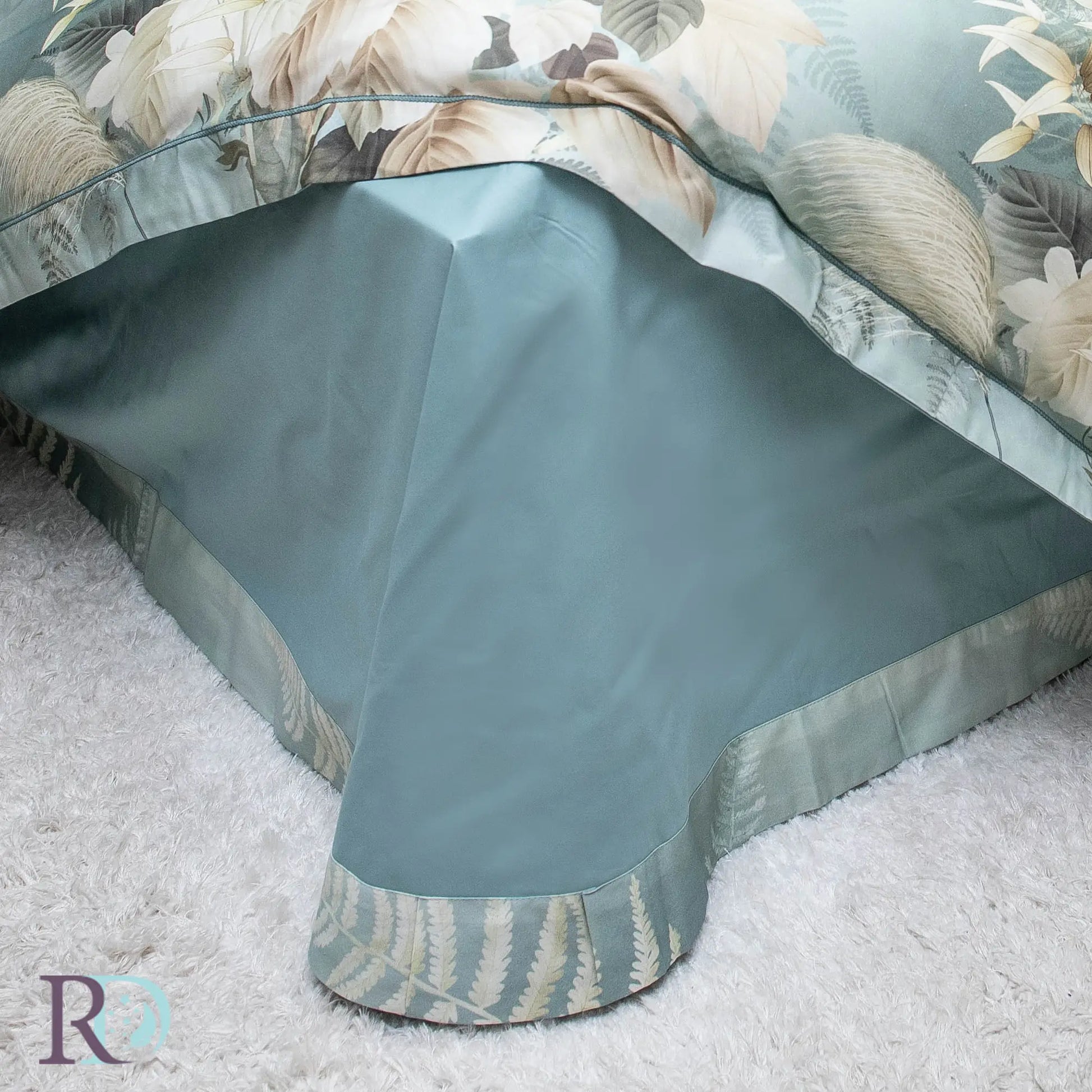 Спален комплект „Дея“ е изработен от гъсто тъкан памучен сатен – 100% памук. Характеризира се с флорални мотиви в меки тонове. Пликът и калъфките са с периферия за по-завършен вид. Долният чаршаф е едноцветен, в ментово зелено, с декоративна драперия от три страни.