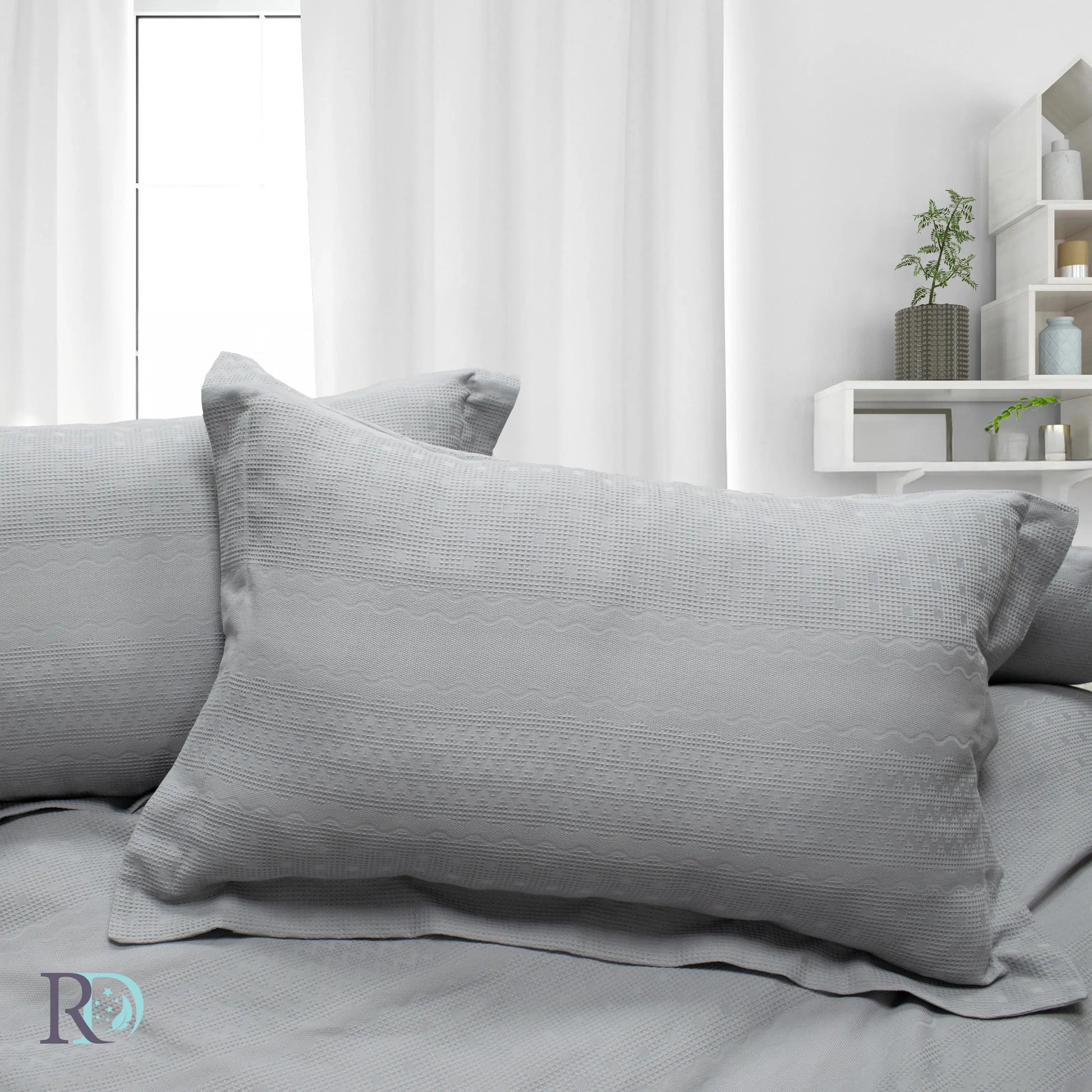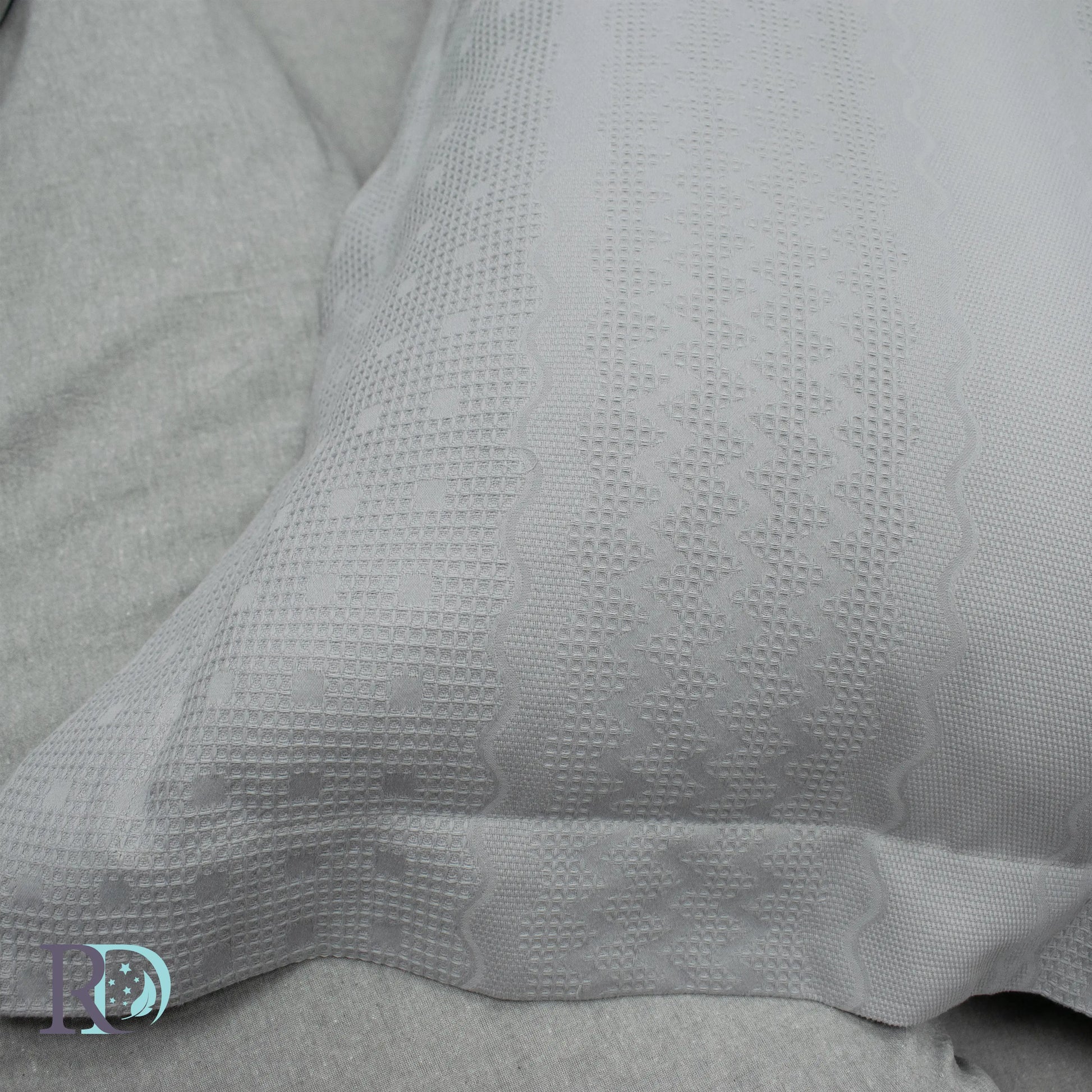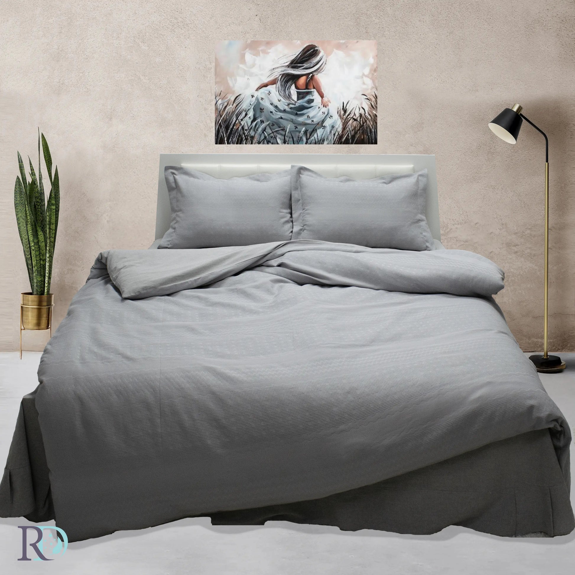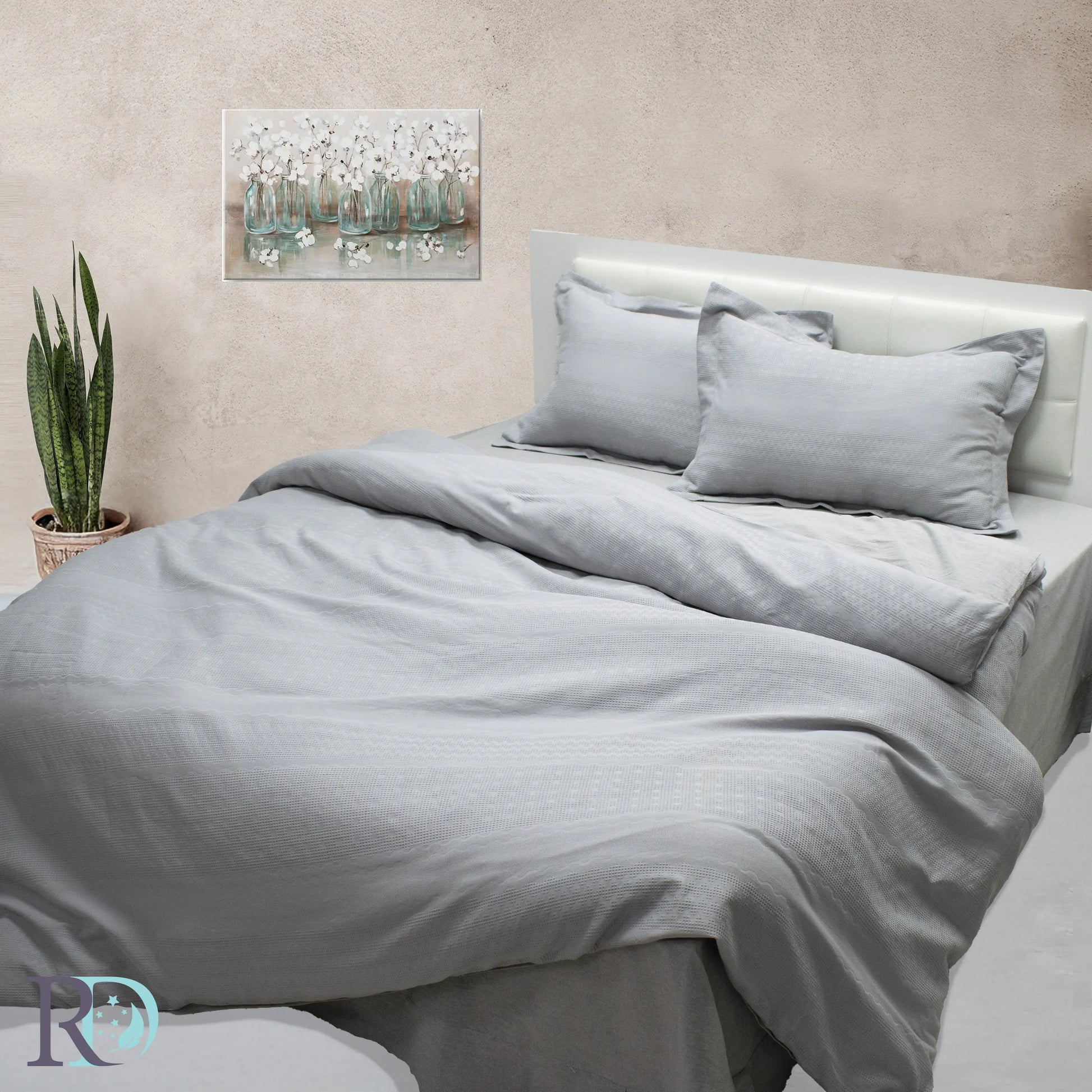 Спален комплект „Нанси“ е в елегантен сив цвят, изработен от 100% памук. Материята е мека и комфортна. Калъфките са с периферия от четирите страни, а чаршафът е с декоративен завършек за по-луксозна визия. Подходящ за ежедневна употреба.