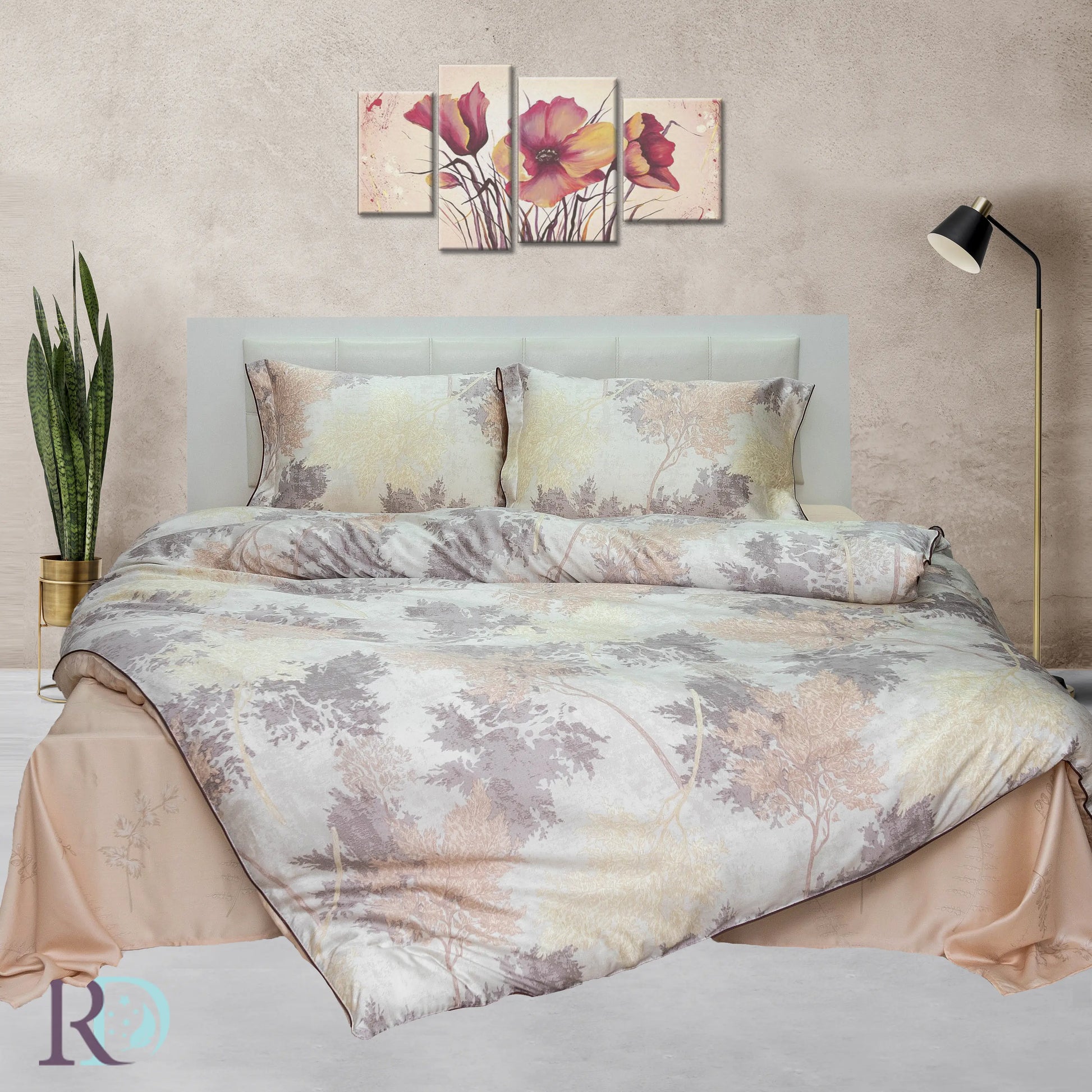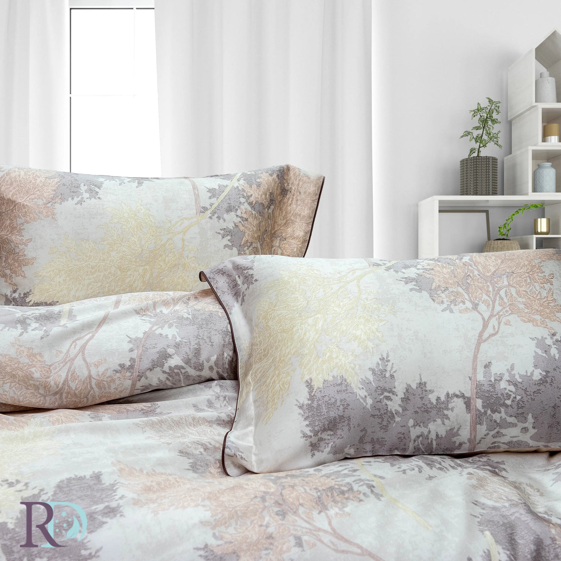 Комплектът "Миглена" е решен в меки, ненатрапчиви цветове, които внасят спокойствие и стил в интериора на спалнята. Пликът и калъфките са декорирани с фино въженце (пасел), което добавя елегантен завършек. Затварянето на плика е с цип, позициониран в долната част – удобно и практично решение.