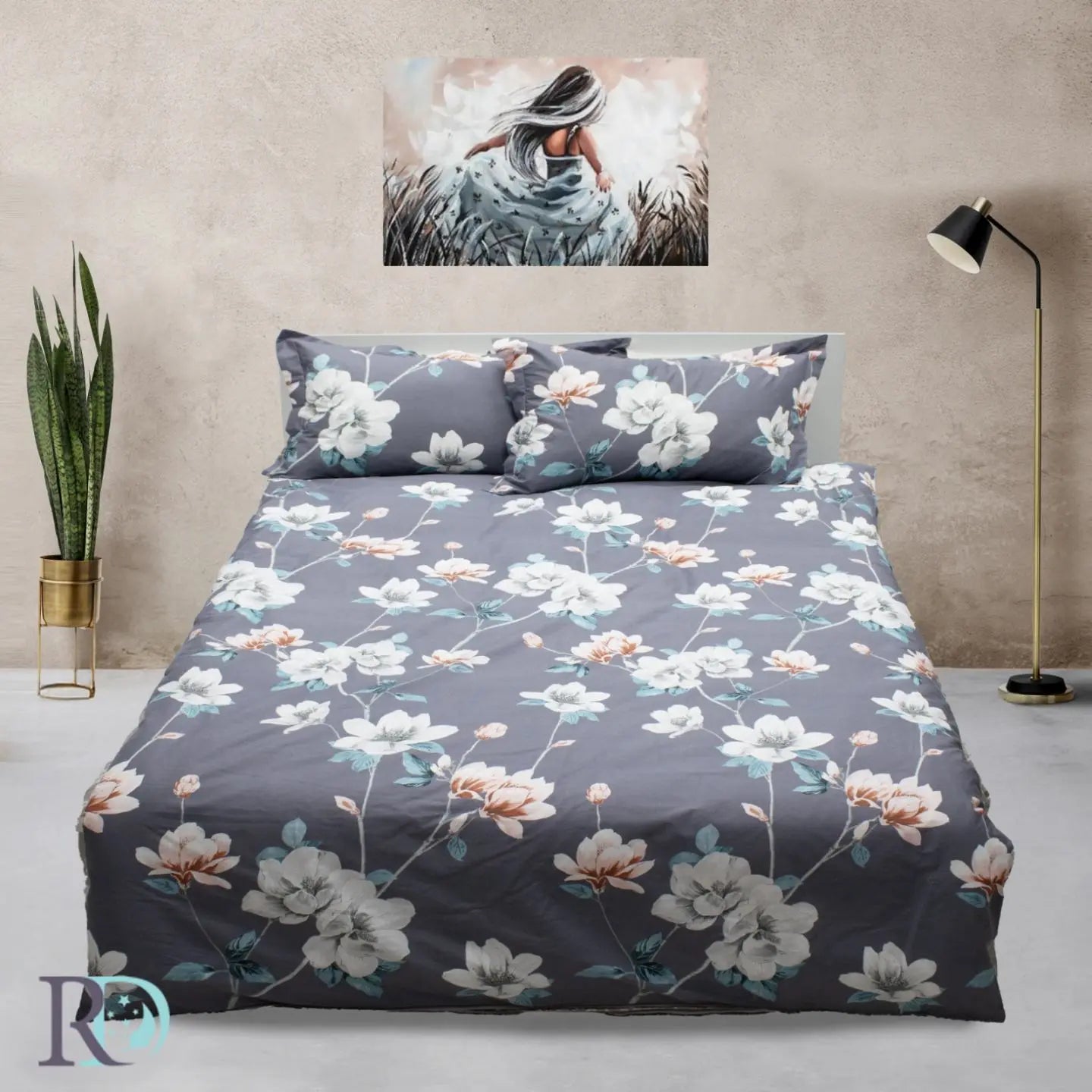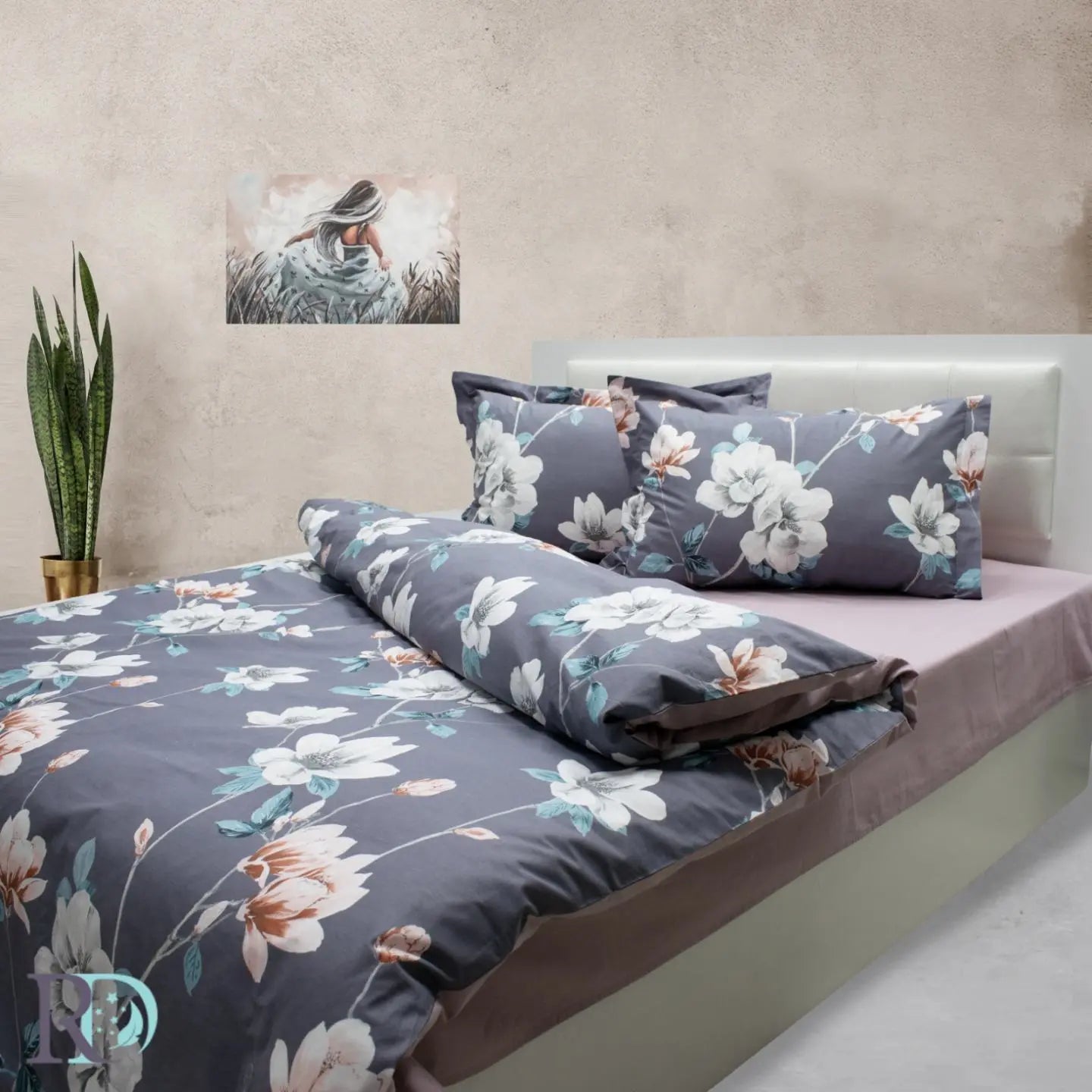 Спален комплект „Хелън“ се отличава с елегантни флорални мотиви, които освежават визията на всяка спалня и внасят нотка романтика в интериора. Калъфките са декорирани с периферия от три страни за по-изискан завършек. Долният чаршаф е в мек, едноцветен тон – пепел от рози.