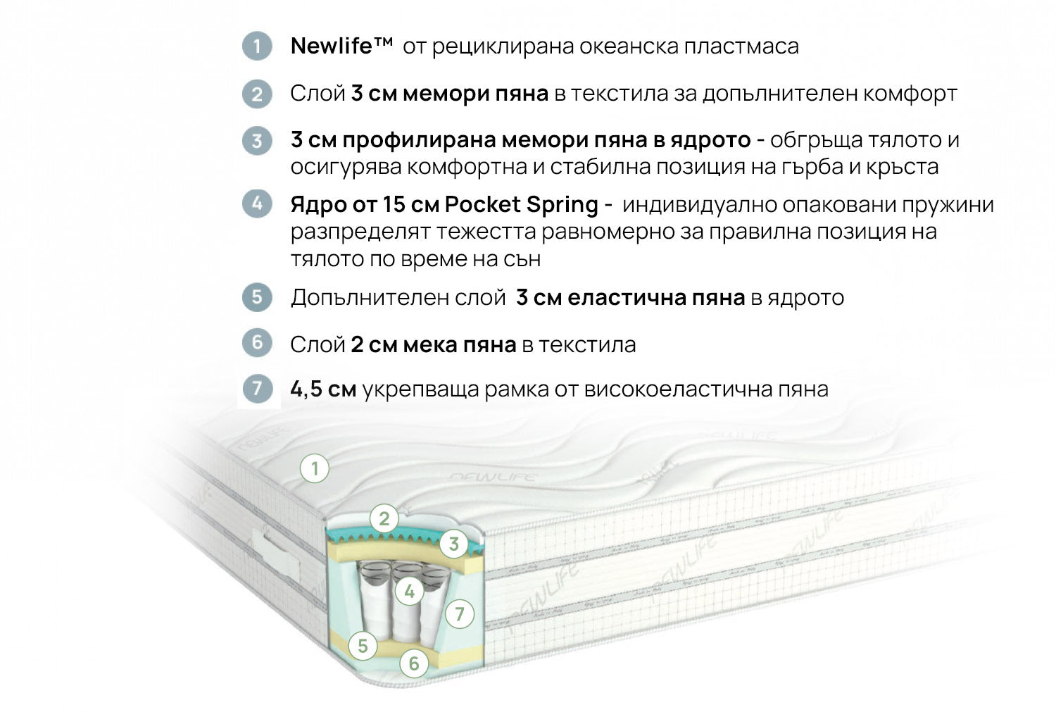 Материята на матрака е създадена от ново поколение рециклирана океанска пластмаса. Този иновативен текстил е обработен за мекота, дишаемост и антиалергичност, предпазвайки ви от бактерии и акари.