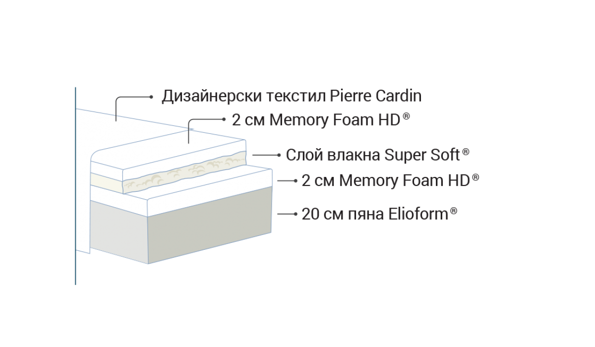 Модерният текстил, създаден от Pierre Cardin, внася нотка на елегантност и разкош във вашия сън. Допълнителните 2 см мемори пяна придават комфорт и подкрепа. Тя първо реагира на натиск, обгръщайки точно вашите контури, а след това се адаптира към телесната топлина, особено в студените зимни месеци.